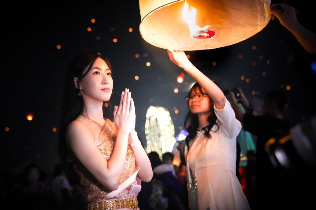 傣族情侣携手放灯,于漫天灯火下甜蜜拥吻;来自上海的青年,写下“去班味”的俏皮祈愿;画着猫脸的少年少女踮脚点燃灯芯,火光映亮他们无忧无虑的笑颜……这一刻,千万个心愿与这座城市在夜空中交织成了最浪漫的注脚。