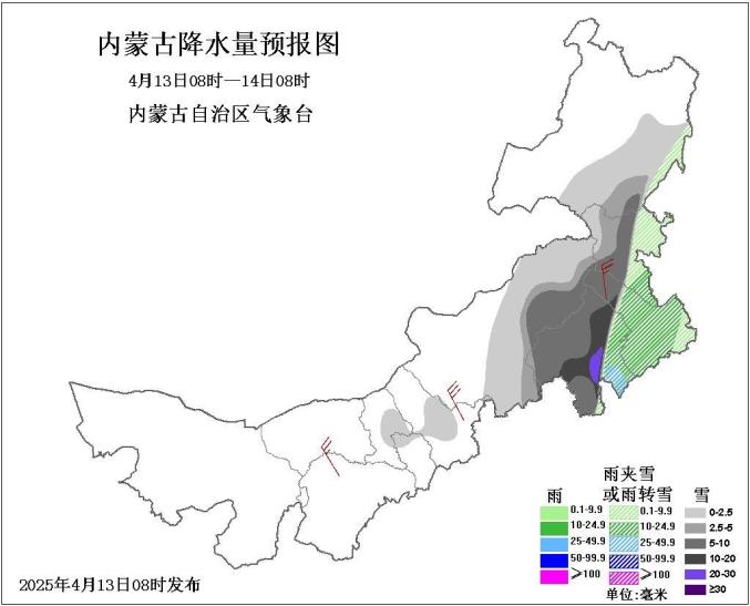 今天,我区中东部大部地区多云,包头市东部、呼和浩特市北部、乌兰察布市中部、锡林郭勒盟南部和东部至呼伦贝尔市南部有小雨或雨夹雪或小雪,其中,锡林郭勒盟东部、赤峰市大部、通辽市大部、兴安盟大部、呼伦贝尔市东南部地区有中到大雪或雨夹雪,局地有暴雪或大暴雪,其余地区晴间多云;西部偏东、中部和东部偏南地区5、6级短时7、8级局地9级以上西北风或偏北风,西部偏东、中部偏西和偏南局地伴有沙尘天气。