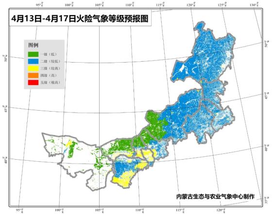 预计未来5天(4月13日-4月17日)我区乌兰察布市西南部部分地区、呼和浩特市大部、包头市南部、巴彦淖尔市南部、鄂尔多斯市东部和南部以及大青山、贺兰山林区等地火险气象等级较高,需要重点关注。4月份是内蒙古大风多发时期,建议相关部门加强用火管理和巡护检查,预防人为火灾发生,同时加强防范境外火灾引发的入境火。
