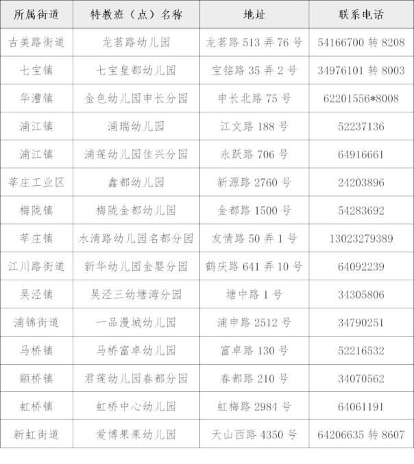 符合闵行区对口入园条件的特殊幼儿,确能坚持参加正常集体活动且能够提供6个月内本市三级及以上医疗机构证明、鉴定报告的,各公民办幼儿园均不得拒收,根据其情况妥善安排随班就读。持有本区户籍需接受学前特殊教育的适龄幼儿可至本街镇开设特教班(点)的幼儿园咨询、登记报名: