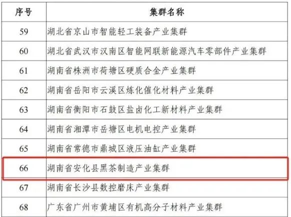 安化县黑茶制造产业集群被评为国家中小企业特色产业集群。2024年9月,国家工业和信息化部印发《关于2024年度中小企业特色产业集群名单的通告》,安化黑茶制造产业集群成功入选,标志着上级部门与社会各界对于安化黑茶产业技术创新、品牌打造等方面的充分肯定,也象征着安化黑茶产业集群整体实力和影响力迈上了新的台阶。