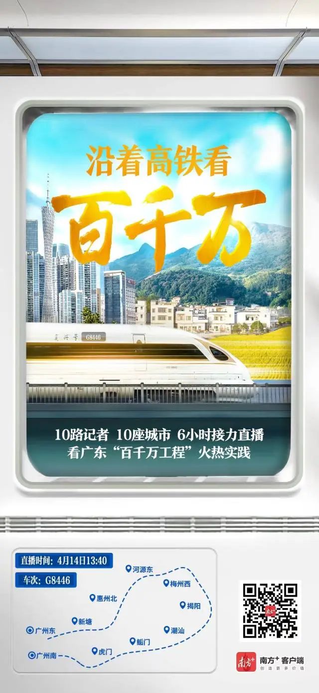 “各位旅客朋友大家好!欢迎乘坐G8446次列车,本趟列车由广州东开往广州南……”4月14日13时42分,随着高铁列车乘务员的播报提醒,由南方日报、南方+客户端策划推出的“沿着高铁看‘百千万’”大型全景直播报道团出发了,镜头聚焦高铁沿线的县镇村实施“百县千镇万村高质量发展工程”(以下简称“百千万工程”)以来的新变化新成效。