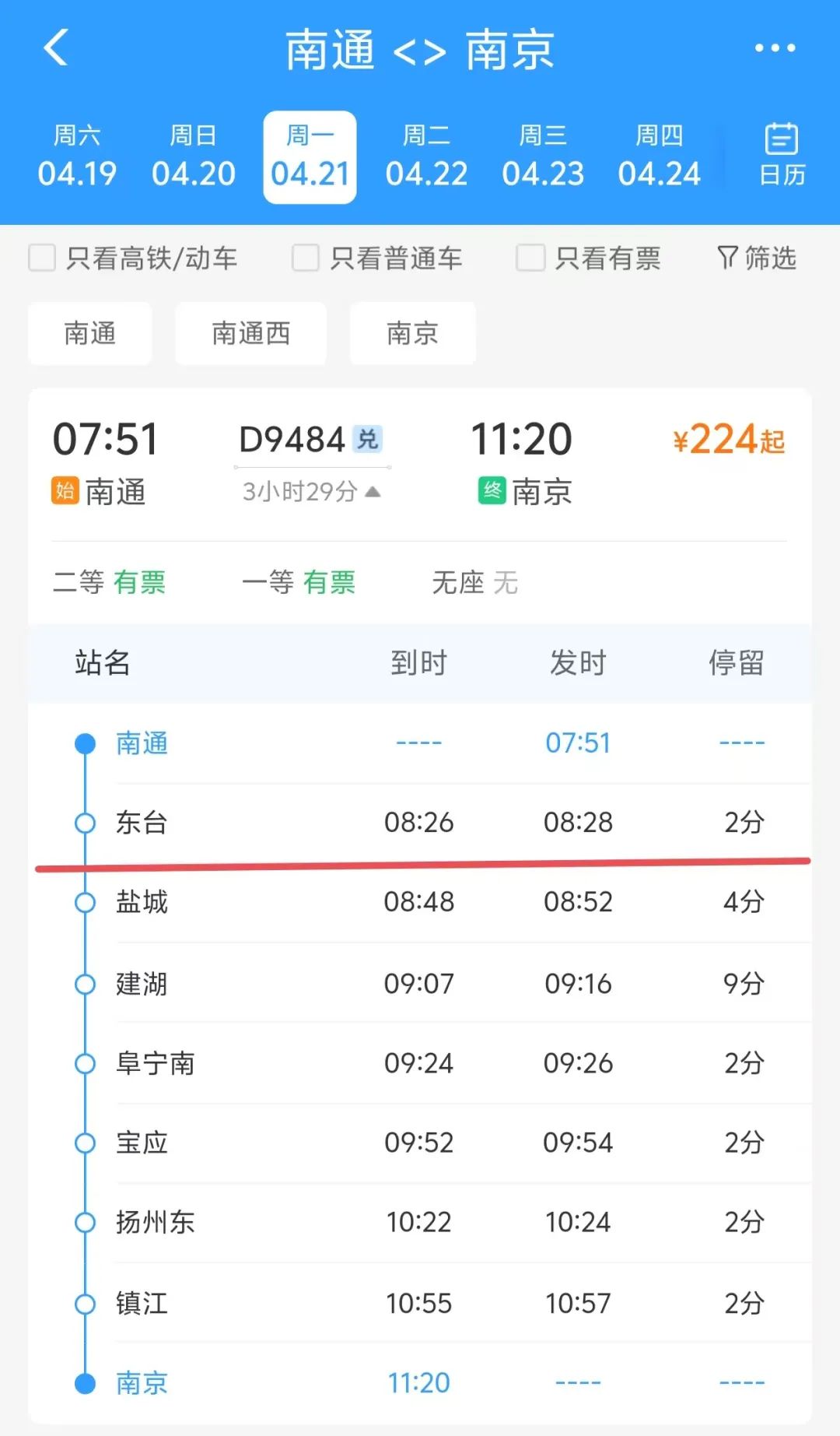 据悉,南通→南京历时3小时29分钟,该趟列车将在东台站停靠2分钟。