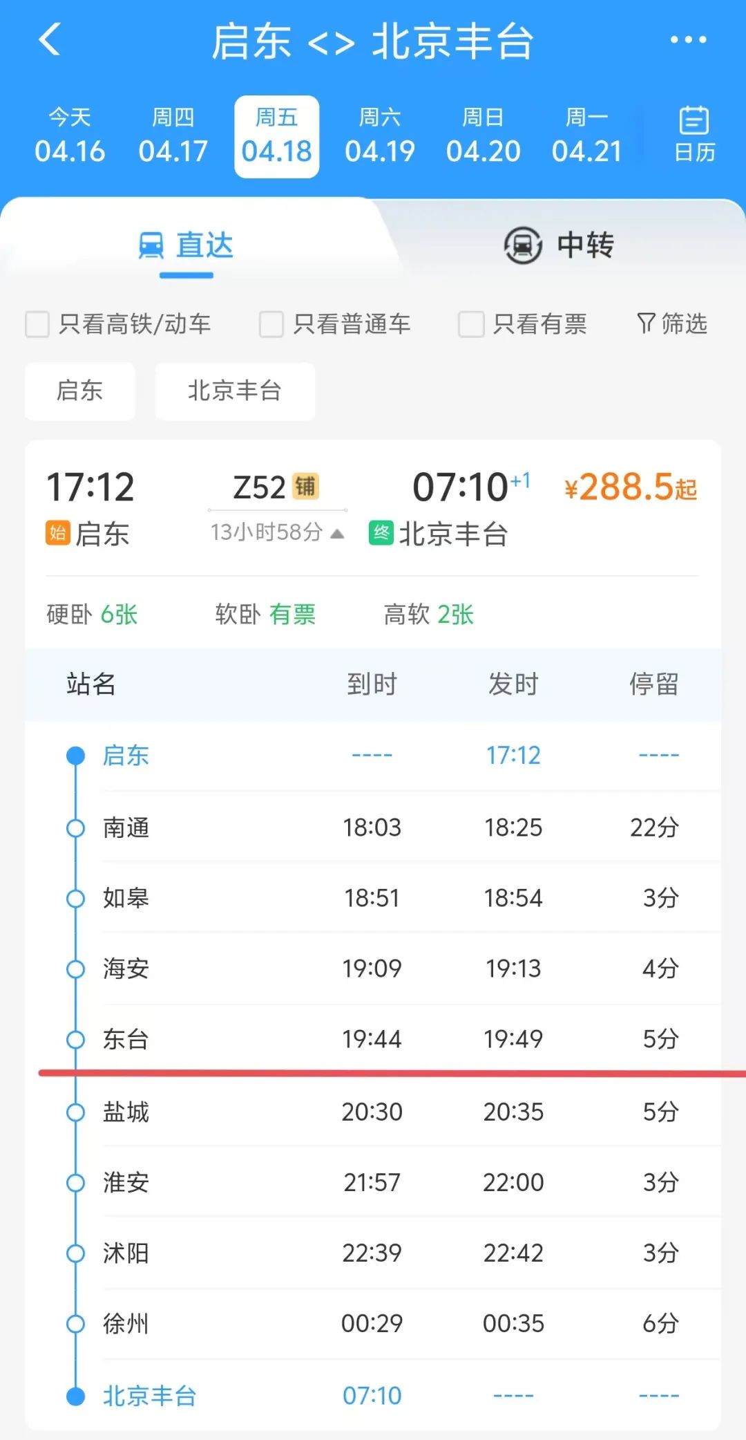 据悉,启东→北京丰台历时13小时58分钟,该趟列车将在东台站停靠5分钟。