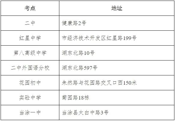 本次考试我市共设置7个考点,分别为:二中、红星中学、第八高级中学、二中外国语分校、花园初中、实验中学和当涂一中。4月18日下午5:00-6:00,各考点对考生开放(不允许进入考场),考生可前往熟悉考点位置,合理规划出行,及时关注天气、交通等因素,注意途中交通安全。各考点地址详见下表: