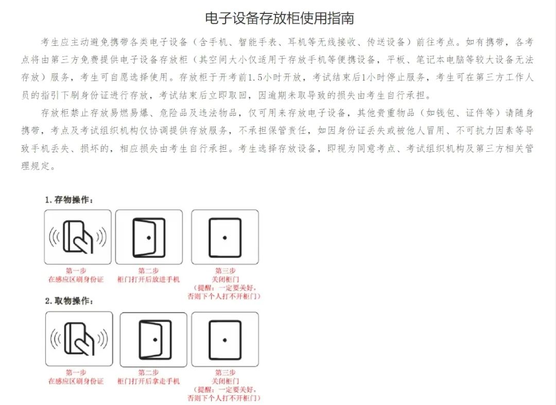 为便于考生手机存放,各考点将由第三方免费提供电子设备存放柜服务,考生可自愿选择使用,详见《电子设备存放柜使用指南》。