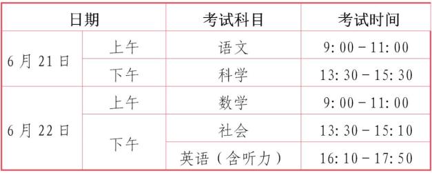 2.文化科目考试时间:6月21日、22日,详细时间安排见下表。