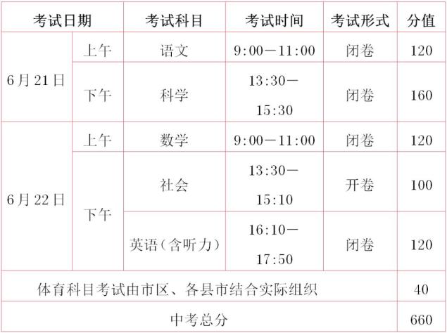 3.市本级体育科目考试根据《金华市教育局关于印发〈金华市初中毕业生体育学业考试方案(试行)〉的通知》(金市教体卫艺〔2021〕2号)和《2025年金华市区初中毕业生体育考试补充通知》实施,各县(市)可根据本地实际参照文件中项目分类确定考试项目供考生选择。考试成绩报告实行分数制,总分660分,其中语文、数学、英语(含听力)满分各为120分,科学满分为160分,社会满分为100分,体育满分为40分。