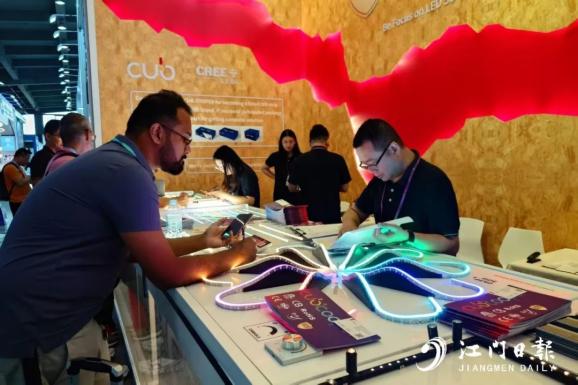 在来自江海区的广东酷柏光电股份有限公司展位前,公司外贸部经理于亮手持“招牌”产品——高压灯带,向围观的国际客商展示着自己的“黑科技”:“这款专利高压灯带可直接接入220V电压,无需额外配置变压器,既能节省采购成本,又能实现更精细化的空间设计。”