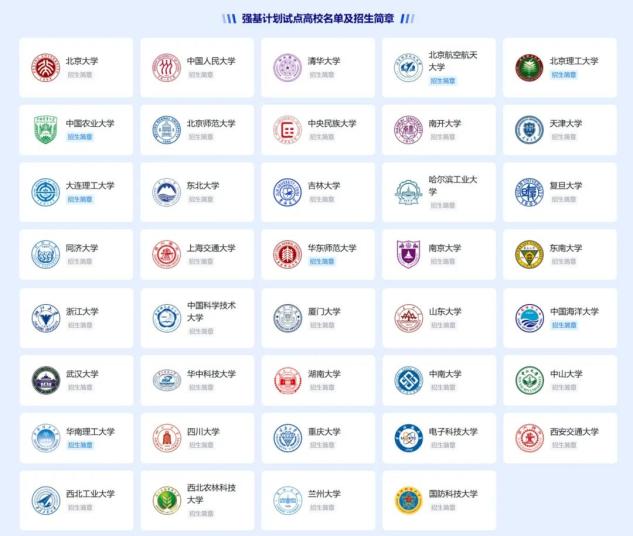 2020年1月,教育部发布《关于在部分高校开展基础学科招生改革试点工作的意见》,决定自2020年起,在部分高校开展基础学科招生改革试点,也称“强基计划”。目前,39所院校2025年强基计划简章正在陆续公布,考生网上报名已经开始。请拟报考的考生及时关注相关政策和高校发布的相关信息,根据简章要求按时完成报名。