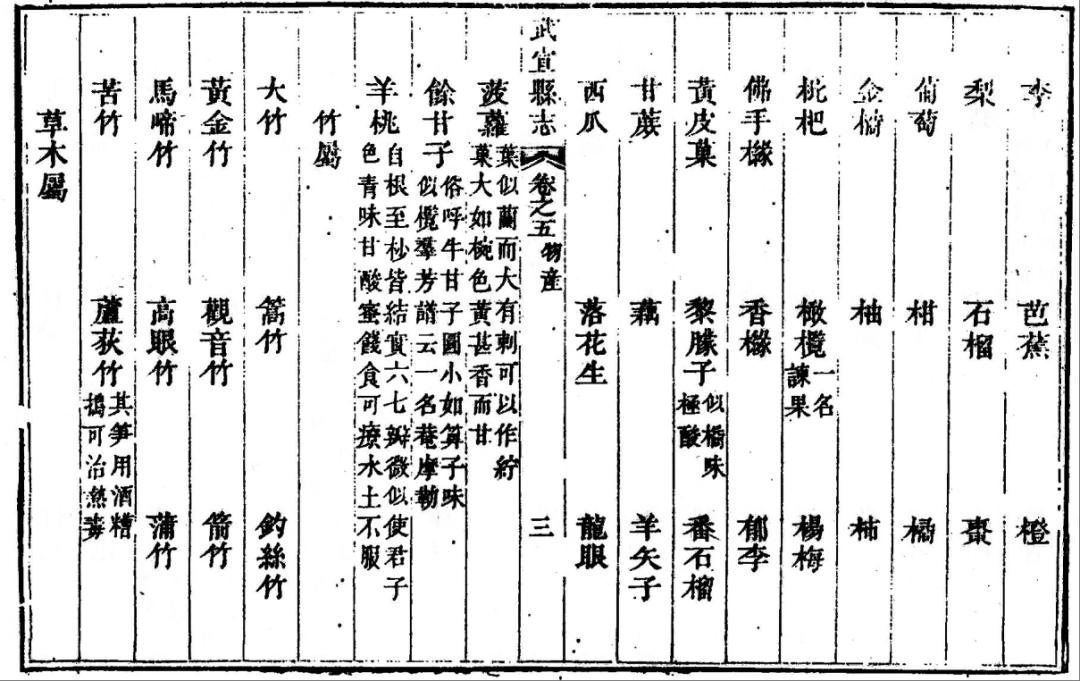 清嘉庆十三年《武宣县志》记载的水果品种如今,武宣境内尚种植上述水果种类,还种有土黄皮、土龙眼、土枇杷、土石榴、土番石榴等。