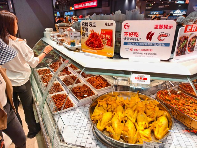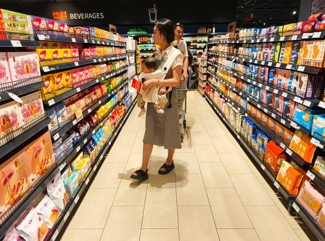 卢山说,目前来看,销售比较好的是东来自主品牌商品,涉及饮料、啤酒、油,还有永辉优选商品,比如纸品、西梅等也销售火爆。烘焙产品的销售也不错,榴莲千层的日销售额已过万元。