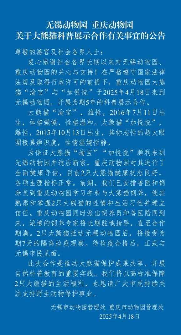 来源:无锡发布、@小甜锡、无锡动物园、中国大熊猫保护研究中心等原标题:《欢迎!大熊猫来无锡啦!》