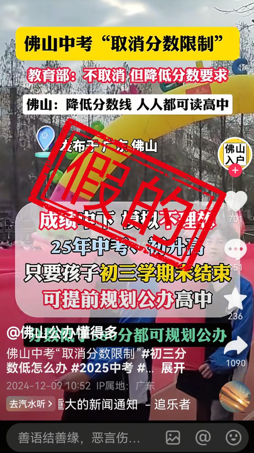 网上这类“标题党”视频背后的动机,主要是为了博人眼球、吸引流量、误导家长,同时不排除出现欺骗家长钱财等违法行为。因此,佛山市教育局建议家长留意“佛山教育”官方微信公众号以及各区、镇街教育部门官方微信公众号,及时了解官方招生政策,注意甄别信息来源,谨防上当受骗。如对招生政策有疑问
