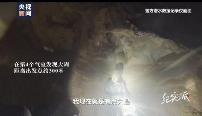 2月6日凌晨4:30,失联9.5小时后,搜救人员在第4个气室发现大周,距离出发点约300米。大周为了不失温,把潜水装备拆下来卡在石缝,人坐在上面。
