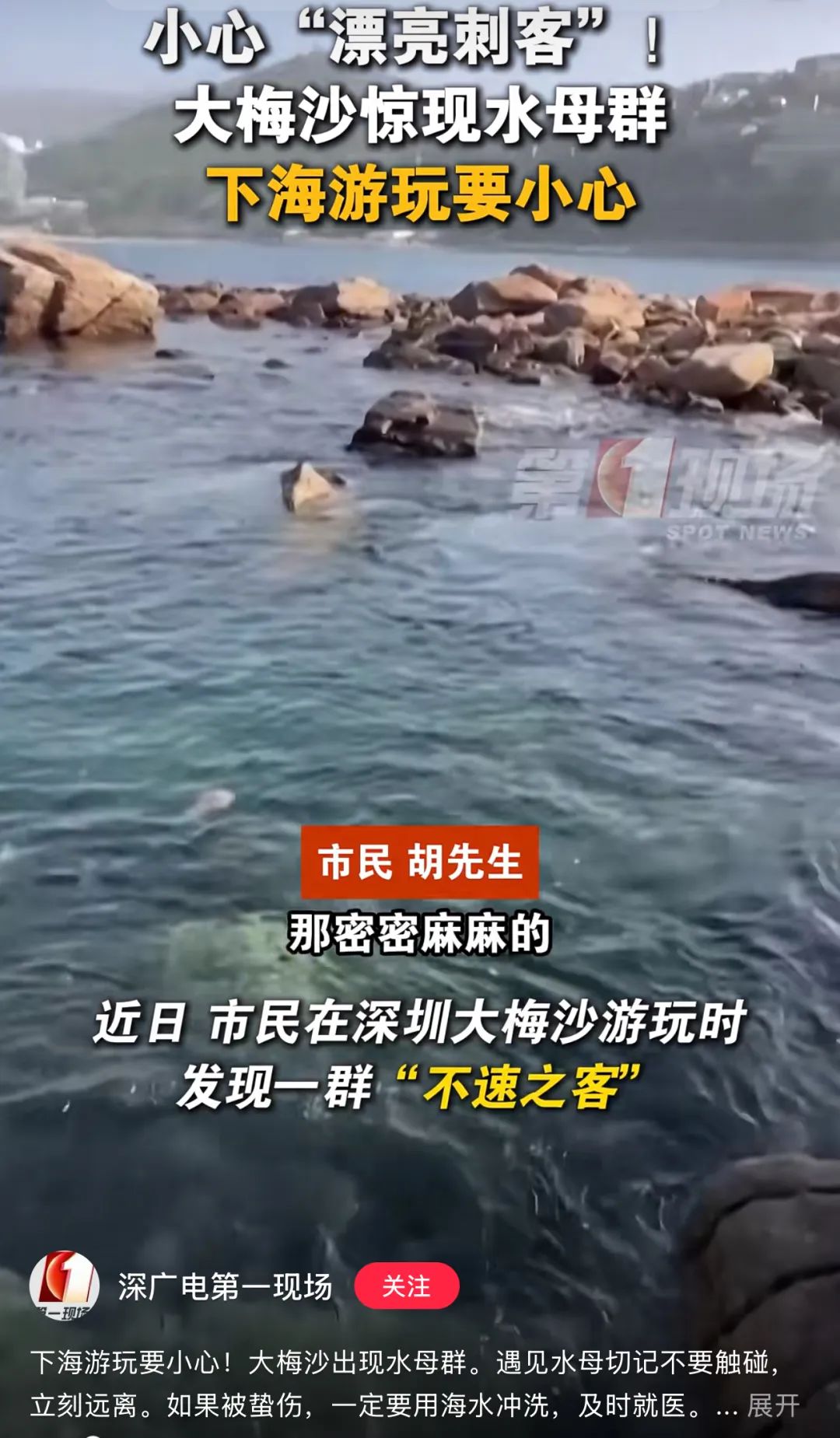 “目前沙滩近岸水母不多,主要出现在防鲨网以及周边海域。”大梅沙海滨公园相关负责人魏鹏程介绍,自4月1日起,公园已通过广播系统每半小时循环播放安全提示,提醒游客在防鲨网内的游泳区游泳。