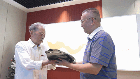 压平折痕,平整叠好,仔细擦拭别在上面的勋章……4月18日,93岁的张显明郑重地把“传家宝”交到儿子张一为手中。