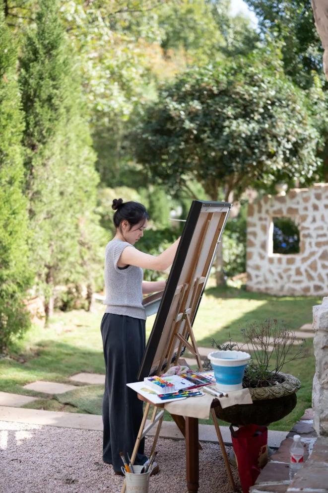 “完成一幅油画需要4-6个小时,而成品一般要当天交付给新人,所以现场绘画时间非常有限。早到场地可以提前观察现场的静物陈设,有能画的背景可以先准备起来,这也是一个婚礼绘画师最基本的职业素养。”