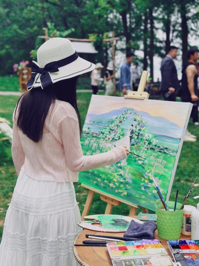小冯在婚礼上作画。受访者供图小冯高校科班出身,学的是油画。3月中旬,她应邀参加宁波一场婚礼。当天早上9点,小冯就已经到了现场,铺开画布、准备颜料,比仪式开始时间早3个小时。