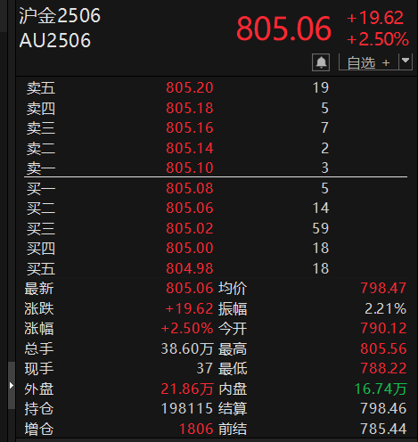 4月21日,上期所黄金期货主力合约突破800元/克关口,创历史新高。截至下午收盘,沪金2506合约大涨2.5%,报805.06元/克。