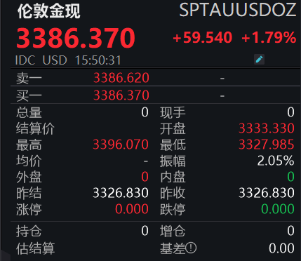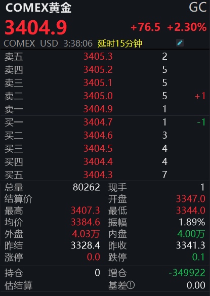 国际方面,伦敦金现盘中突破3390美元/盎司,COMEX黄金盘中更是站上了3400美元/盎司大关。截至记者发稿,伦敦金现最高触及3396.07美元/盎司,COMEX黄金最高触及3407.3美元/盎司。