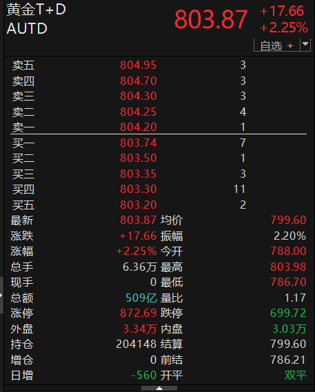 现货方面,黄金T+D盘中最高触及803.98元/克,创下历史新高。截至下午收盘涨2.25%,报803.87元/克。