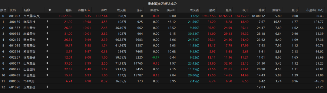 值得注意的是,今日A股市场上,黄金股也迎来集体爆发。贵金属板块今日大涨8.35%,晓程科技20CM涨停,四川黄金、赤峰黄金、湖南黄金、西部黄金等多股封上10CM涨停板。