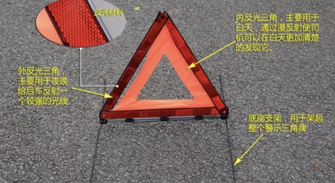 外面有一个反光的三角,中间有一个荧光的三角,同时,底下还有一个底座。外面的反光三角是为了夜间汽车灯光照射之后能反射一个较强的光线给后面车辆的司机。