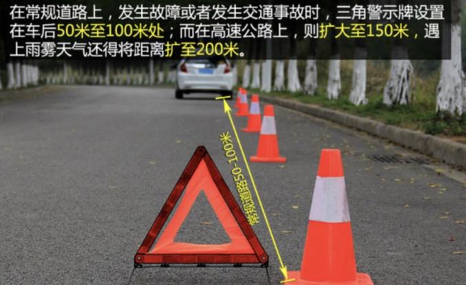 而在高速公路上,则要在车后150米外的地方设置警示标志,若遇上雨雾天气,还得将距离提升到200米。