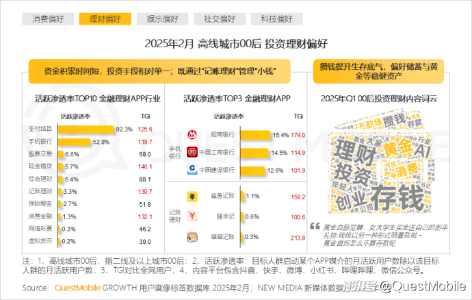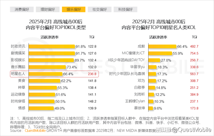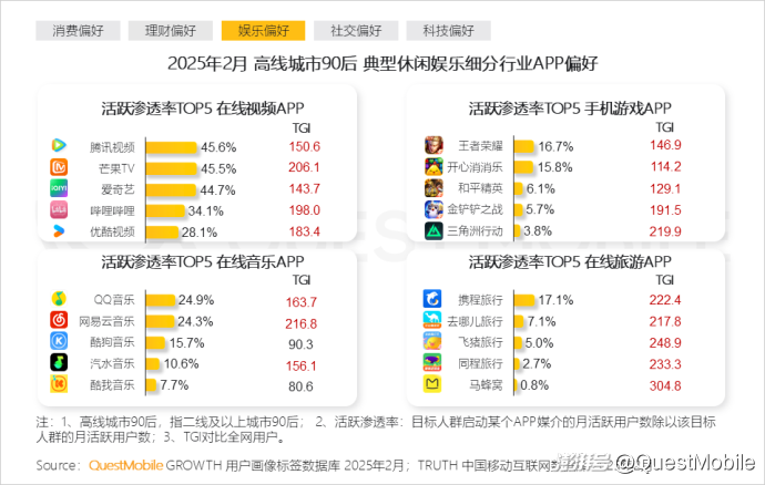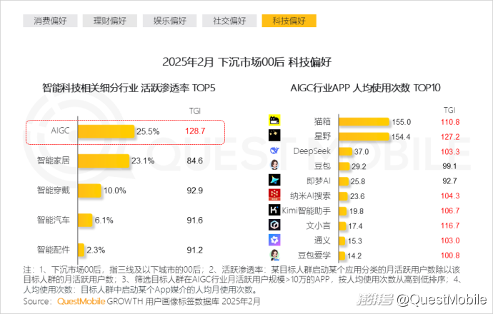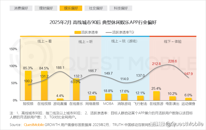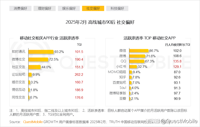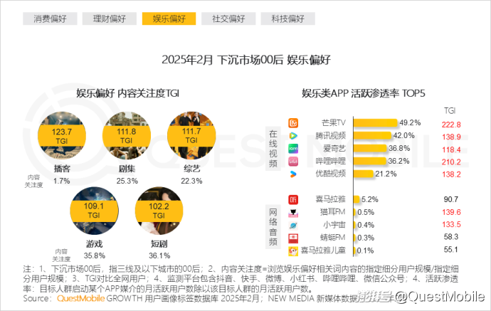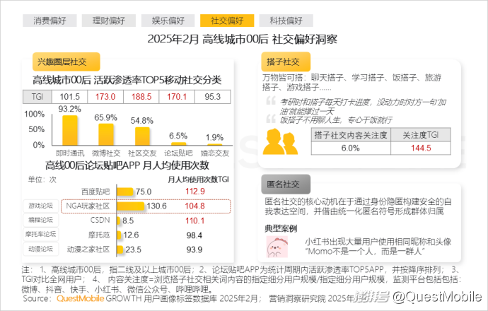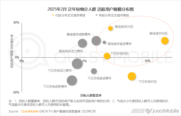 本报告泛年轻人群指00后、90后人群,泛年轻细分人群按代际分布交叉城市等级,典型细分人群选择2025年2月月活跃用户规模TOP3,即高线城市00后、下沉市场00后、高线城市90后