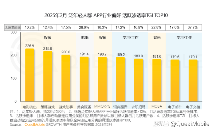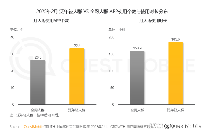 QuestMobile数据显示,与全网人群相比,泛年轻人群月人均使用APP个数多7个,月人均使用时长增加26.7小时。