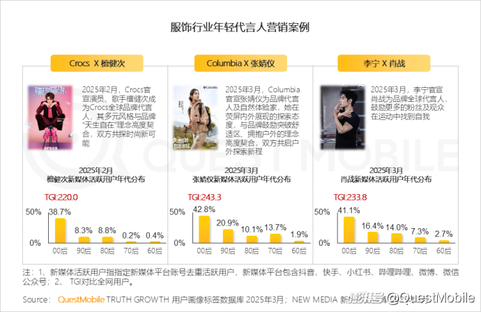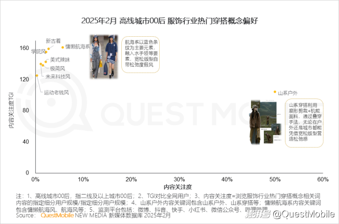 2、高线城市00后用穿搭表达个性,偏好“松弛感+功能潮酷”,品牌通过年轻代言人等方式重构年轻市场认知