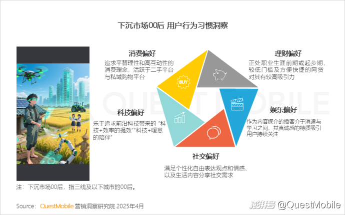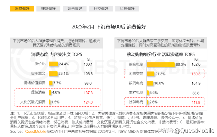 1、下沉市场00后活跃于二手平台与私域购物平台,同时追求“科技+效率的提效”“科技+暖意的陪伴”
