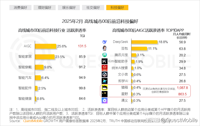 高线城市00后对工具类AIGC APP月人均使用时长大部分低于1小时,主打“用完就跑,绝不深交”,猫箱、星野情感类APP月人均使用时长800+分钟, “AI纸性恋”成为新潮流。
