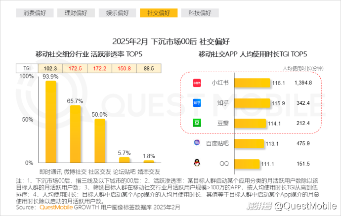 QuestMobile数据显示,下沉市场00后人群在小红书、知乎、豆瓣上人均使用时长分别为23.2小时、5.7小时、3.5小时。
