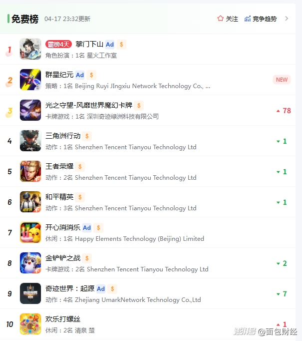 根据全球移动应用、游戏数据监测服务商点点数据的监测,4月17日上线当天,《群星纪元》位居中国内地App Store游戏免费榜第2。