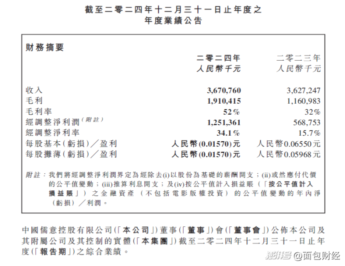 中国儒意最新发布的2024年度财报显示,这家涵盖内容制作、流媒体平台及游戏业务的综合性文娱企业全年收入微增至36.71亿元,但受金融工具公允价值变动影响,归母净利润由盈转亏。不过,公司经调整净利润同比上升120%至12.514亿元,表现较好。