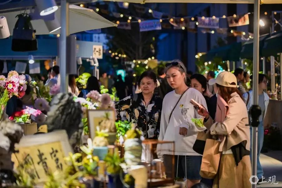 除了赏花,新天地区域还为消费者打造了丰富的逛游体验。上海新天地在距离太平湖约500米的商办综合体——太平洋新天地内,打造了一座城市花市——“东台好市·花语集”,超过100种时令花卉和逾80万株鲜花绿植亮相。烂漫春光里,身处繁花中,又遇久违的花市,消费者的购买力被激发。“在这里的销售比在其他集市要好,一上午已经卖出不少了,新天地人群很有购买力!”18日当天,“古川花店“的摊位前,店员应接不暇。这家花店主要经营各种束花,29.9到69.9元不等。店员说,很多人一买就是两三束,还有年轻人请我们帮忙搭配,现场束花,按照品种和支数算钱。一位年轻女孩刚请她扎了一束花,花费159元。