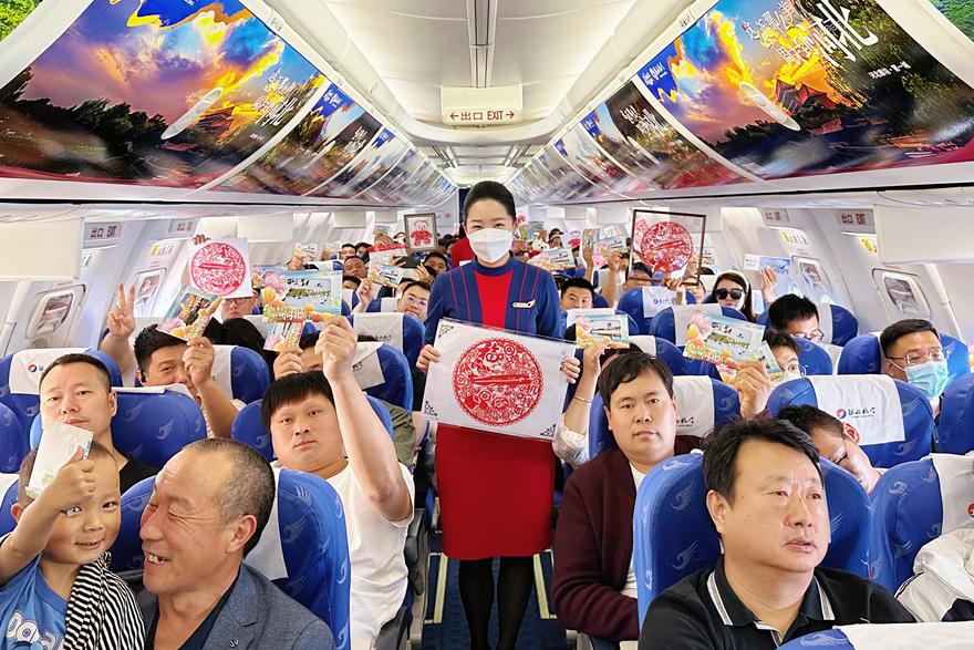 河北省文化和旅游厅与河北航空联合推出“河北旅游”主题航班,并为游客发放文创纪念品。河北省文化和旅游厅供图