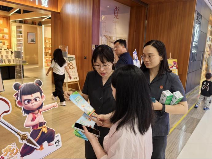 活动中,法院干警向商场来往群众和周边商铺发放知识产权宣传资料,并结合审理的侵犯著作权、商标权等典型案例为群众普及与日常生活息息相关的知识产权法律常识,提醒商家在经营中注意防范知识产权侵权法律风险,引导商家合法合规经营。