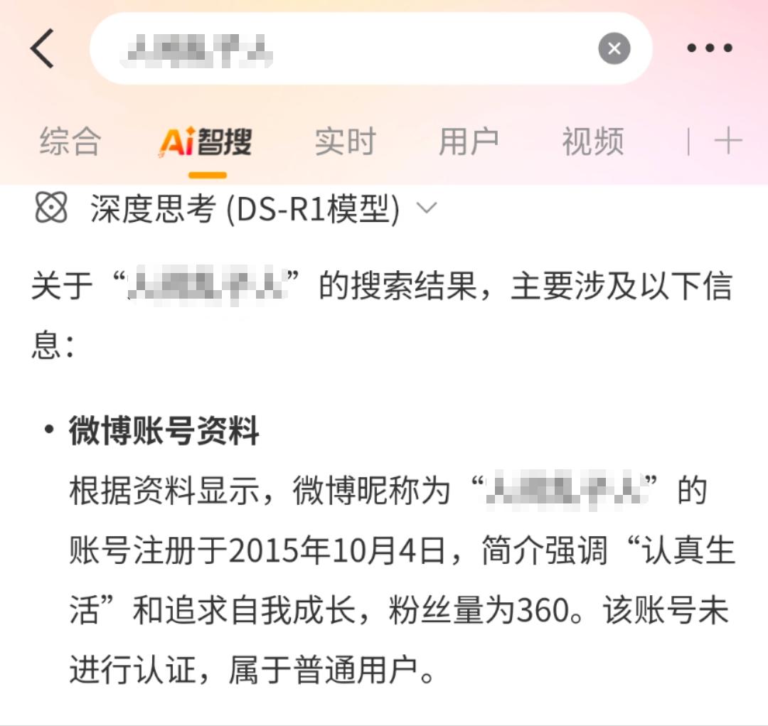 当你搜索某一事件时,AI可以帮你快速总结整起事件的来龙去脉,但在精准搜索某一个人、某一个小众网名时,AI强大的搜索、分析、总结能力也让部分人不寒而栗。