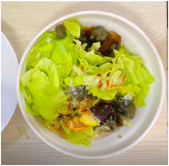 第三步:戴上一次性手套,用厨房剪刀依次将100克虾仁、50克生菜剪成方便食用的大小,皮蛋捏碎,放入碗中。