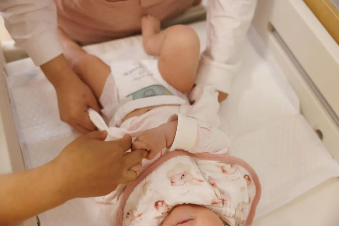 作为实习学生之一的托育专业2023级学生王明伟,在保育师的指导下,小心翼翼地给不到6月龄的小宝宝换尿布、喂奶。