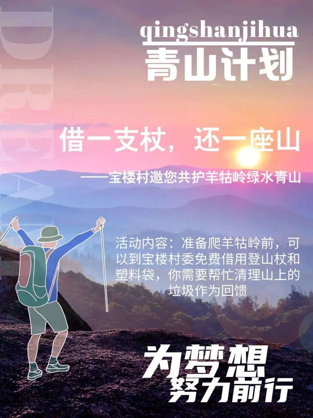 活动内容:准备爬羊牯岭前,可以到宝楼村委免费借用登山杖和塑料袋,你需要帮忙清理山上的垃圾作为回馈。