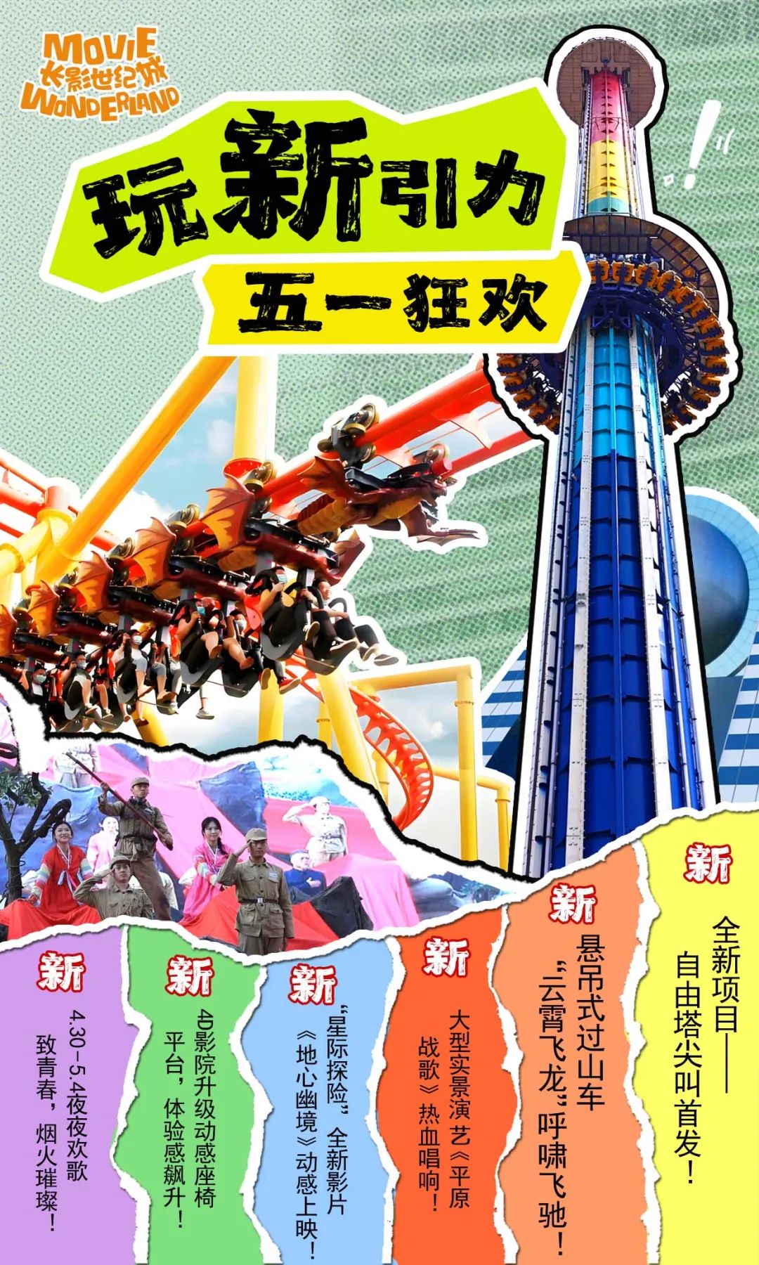 作为园区全新“尖叫担当”,跳楼机将于五一假期正式运营!游客在近百米高空感受风驰电掣与瞬间失重的双重刺激;过山车项目也将同步开放,360度旋转“车程”,为游客送上心跳加速的巅峰体验。