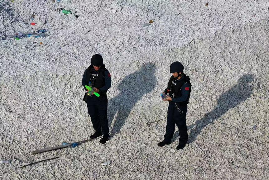 据《环球时报》记者了解,此次维权执法行动中,中国海警执法员登上铁线礁进行巡查,并对菲方非法活动的相关情况进行视频取证。此外,中国海警执法员还在铁线礁展示五星红旗宣示主权,并清理铁线礁上残留的塑料瓶、木棍和其他碎片垃圾。
