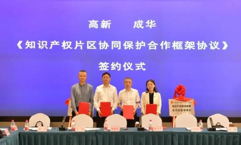 成华法院党组副书记、副院长王磊,高新法院党组成员、副院长张引千与共同为“高新法院知识产权跨域管辖成华巡回审理点”揭牌。高新市场监管局党组成员、副局长冯晓静,成华市场监管局党组成员、副局长张宇共同为“成华法院知识产权司法服务工作室”揭牌。协议会签