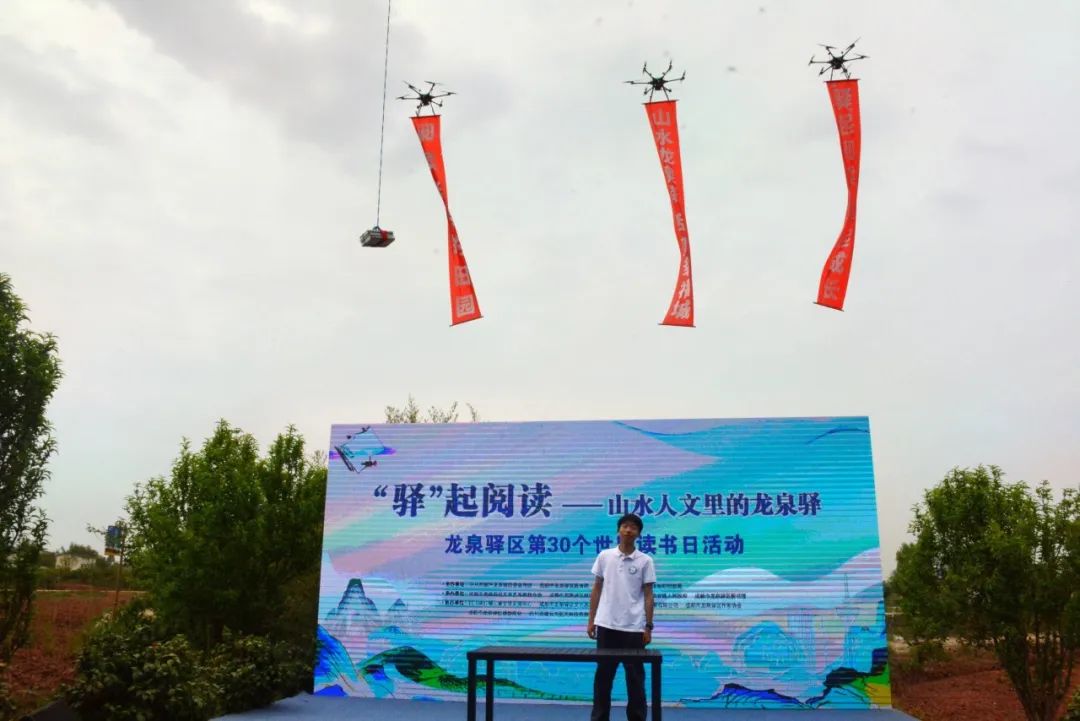 值得一提的是,为了助力“书香成都﹒书香田园”打造,活动还举行了无人机送书表演。无人机运载着国学大家王叔岷的套装书籍,从洛带镇运送到飞翔田园,把书运送到阅读者手中……这场无人机高空特技惊艳四座。