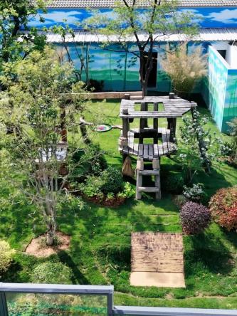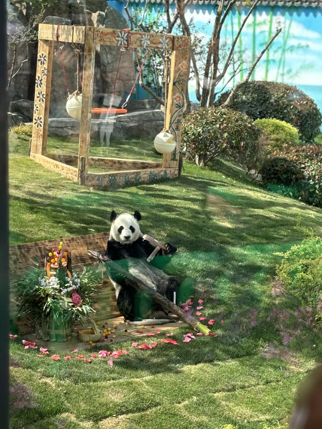 场馆外场,可谓名副其实的“自然游乐场”,包含草地、乔木遮阴、原木栖架假山水池、花草灌木等设施,地势起伏模拟自然栖息环境,满足熊猫攀爬、泡澡、休憩等行为需求。场馆中还准备了丰富的丰容玩具,蹦床、秋千、取食器等等。