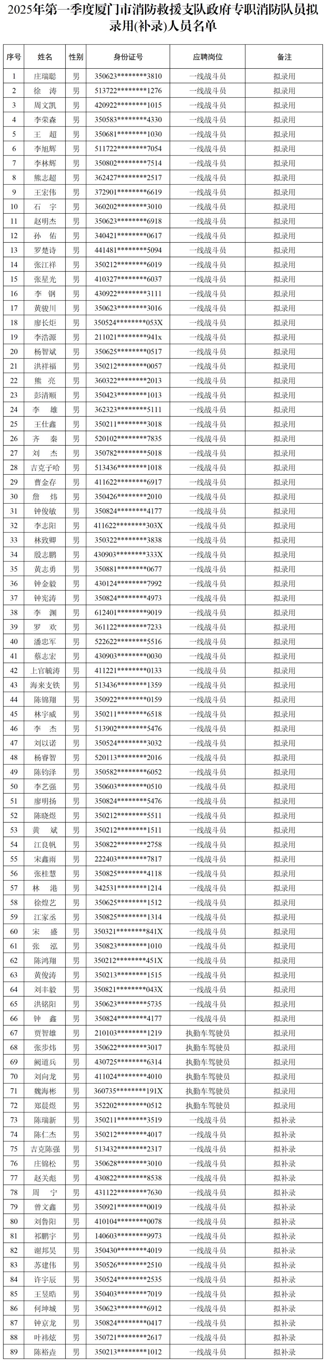 2025年第一季度厦门市消防救援支队政府专职消防队员拟录用(补录)人员公示